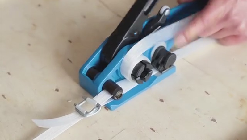 Pump the handle or lever repeatedly. The tool grips and pulls the strap tighter with each movement. - Secure the Strap